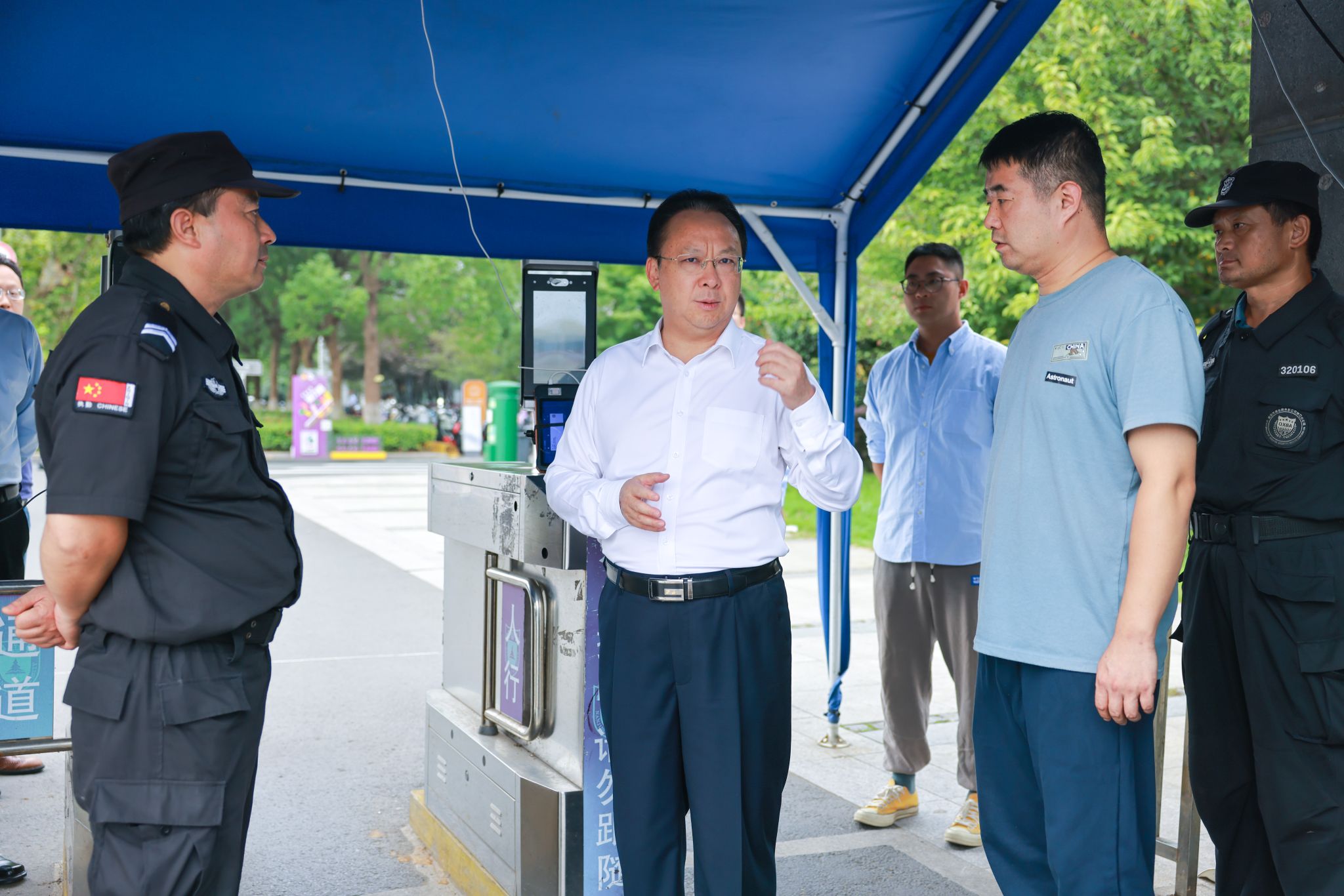 谭铁牛带队在仙林校区进行安全检查,他来到仙林校区凯发门,向坚守岗位的门卫人员致以衷心的感谢和节日的问候。谭铁牛深入考察了校园出入管理制度、值班安排以及相关工作的具体落实情况,并对校门附近区域的校园环境优化、校园文化建设等工作进行详细部署。