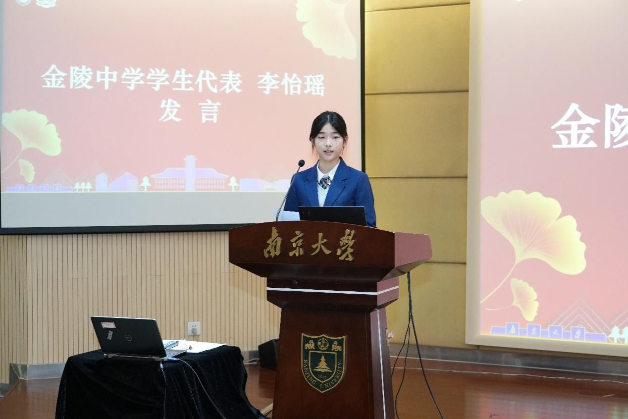 金陵中学学生代表李怡瑶发言,表示将珍惜这次难得的机会,以严谨的态度对待每一个实验,以创新的思维探索每一个问题,以不懈的努力追求科学真理。
