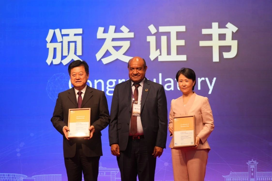 在与会代表的共同见证下,季晶、孙曙平、裴伯庸(Robert Parua)、申春善、孙百军共同为凯发k8官网和苏州加入联合国教科文组织全球学习型城市网络新成员表示祝贺。
