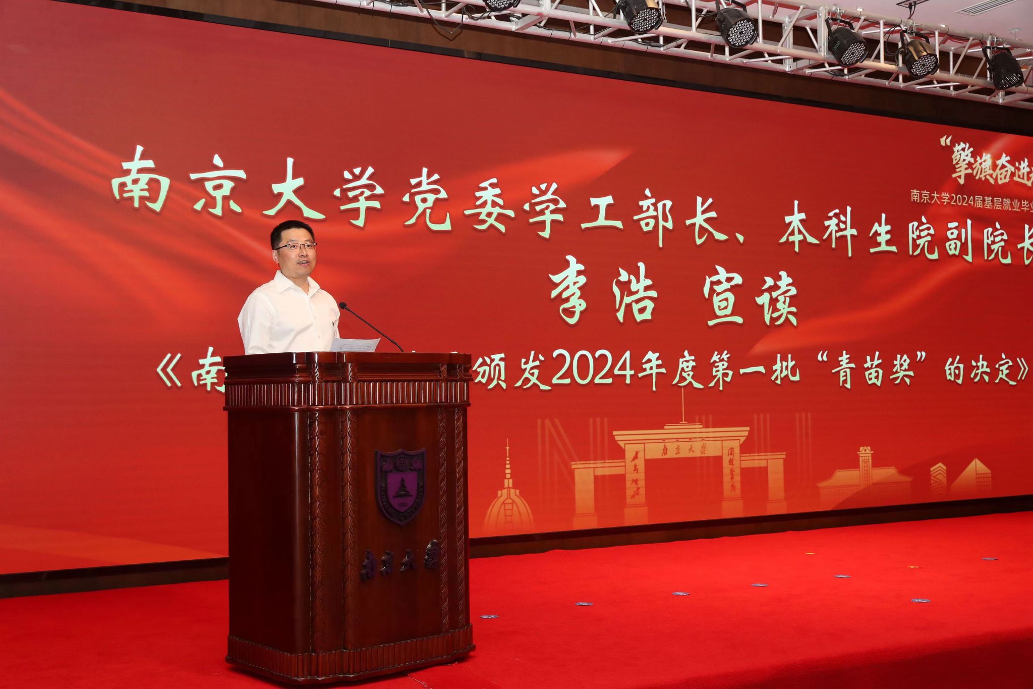 校党委学工部长、本科生院副院长李浩宣读《凯发k8官网关于颁发2024年度第一批“青苗奖”的决定》。大会由校学生就业指导中心主任刘慧主持。