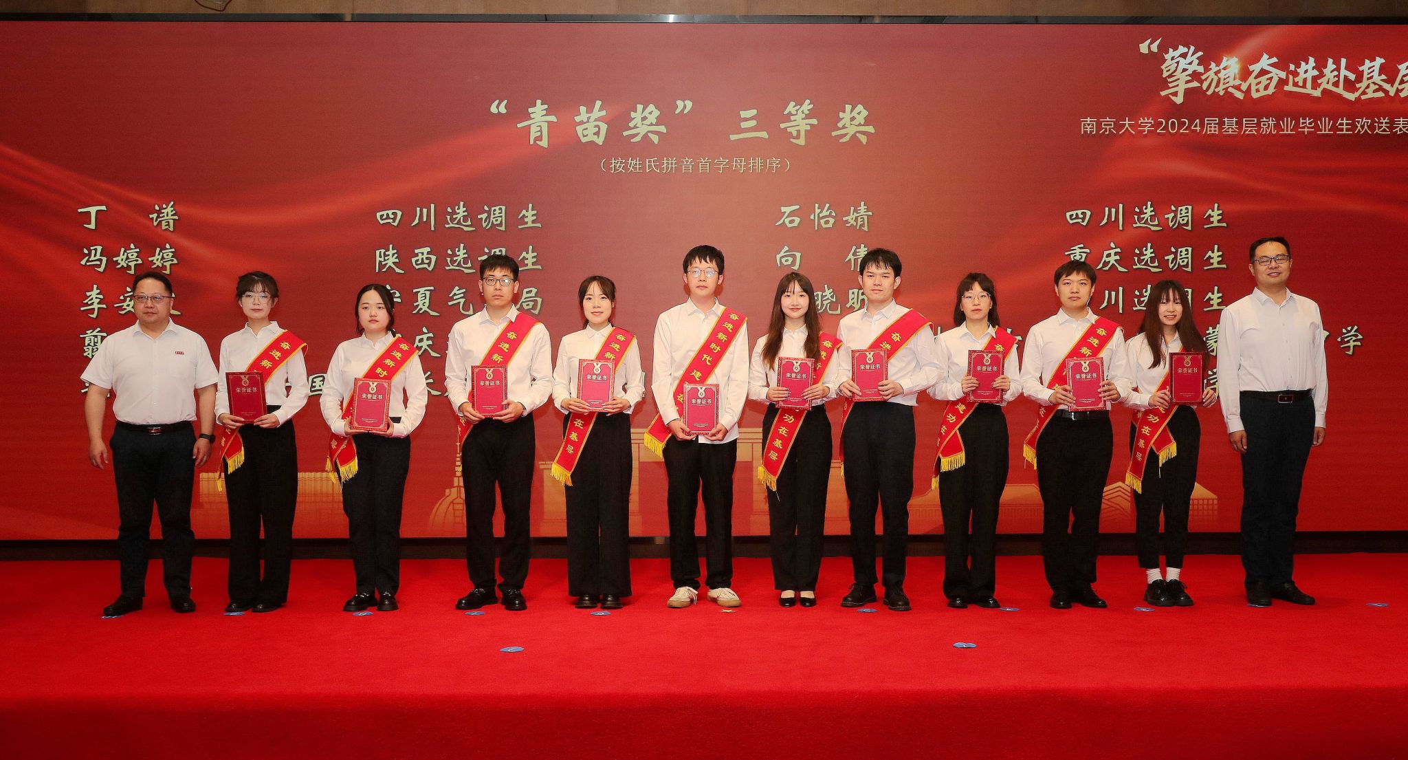 会上还举行了基层就业毕业生出征授旗仪式和凯发k8官网2024年度第一批“青苗奖”颁奖仪式。谭铁牛、许慧玲为毕业生代表授旗。谭铁牛,凯发k8官网党委常委、副校长陆现彩,校团委书记朱翰墨,苏州校区党工委副书记、管委会副主任陈谦等与会嘉宾为获奖学生代表颁奖。“青苗奖”旨在表彰鼓励我校赴重点领域、基层一线就业的毕业生。