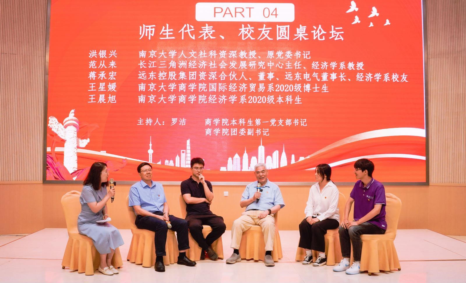 随后,在商学院本科生第一党支部书记罗洁的主持下,洪银兴、范从来、蒋承宏同商学院本科生、研究生党员代表进行座谈。他们围绕如何树立和坚守信仰,将个人所长、专业所学、国家所需有机结合等方面开展现场交流,并寄语现场师生。参会嘉宾表示,在学术研究领域,要积极响应新质生产力发展要求,着力分析人工智能时代生产力和生产关系的新变化、新调整,加快建设中国经济学;在经济实践主战场,更要弘扬报国情怀,不断提升自身能力,报效国家、服务人民,做中国式现代化的建设者。