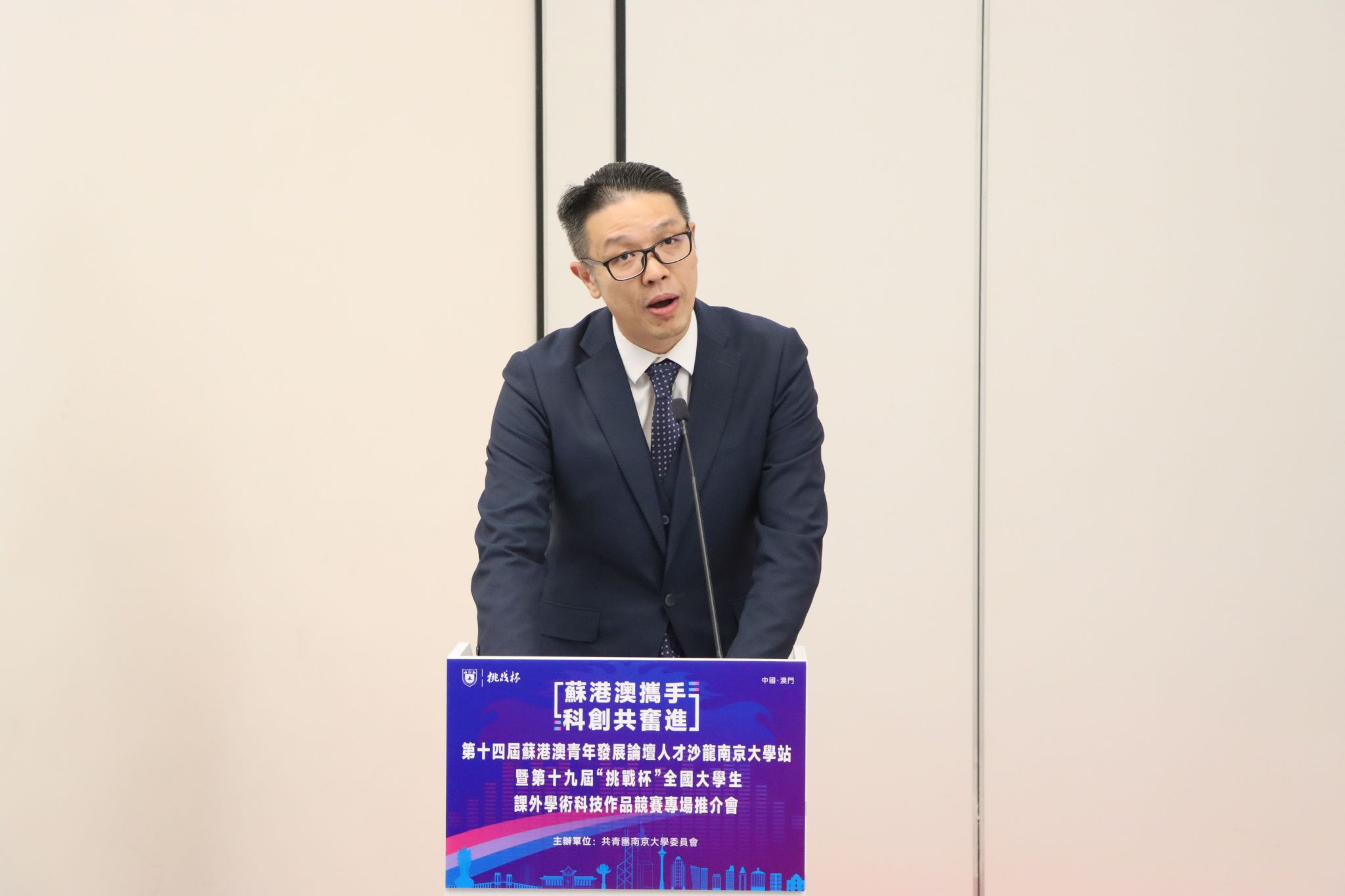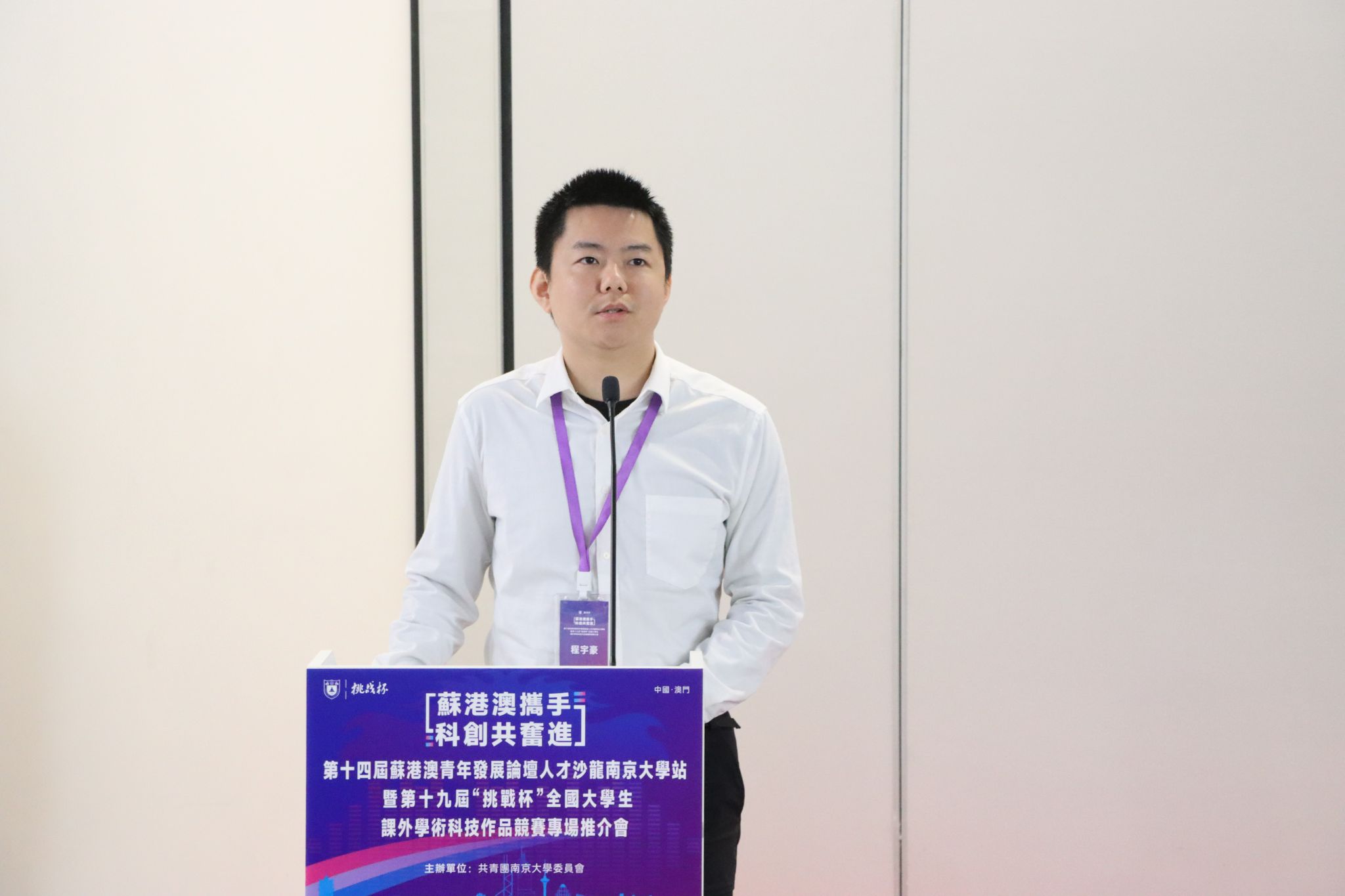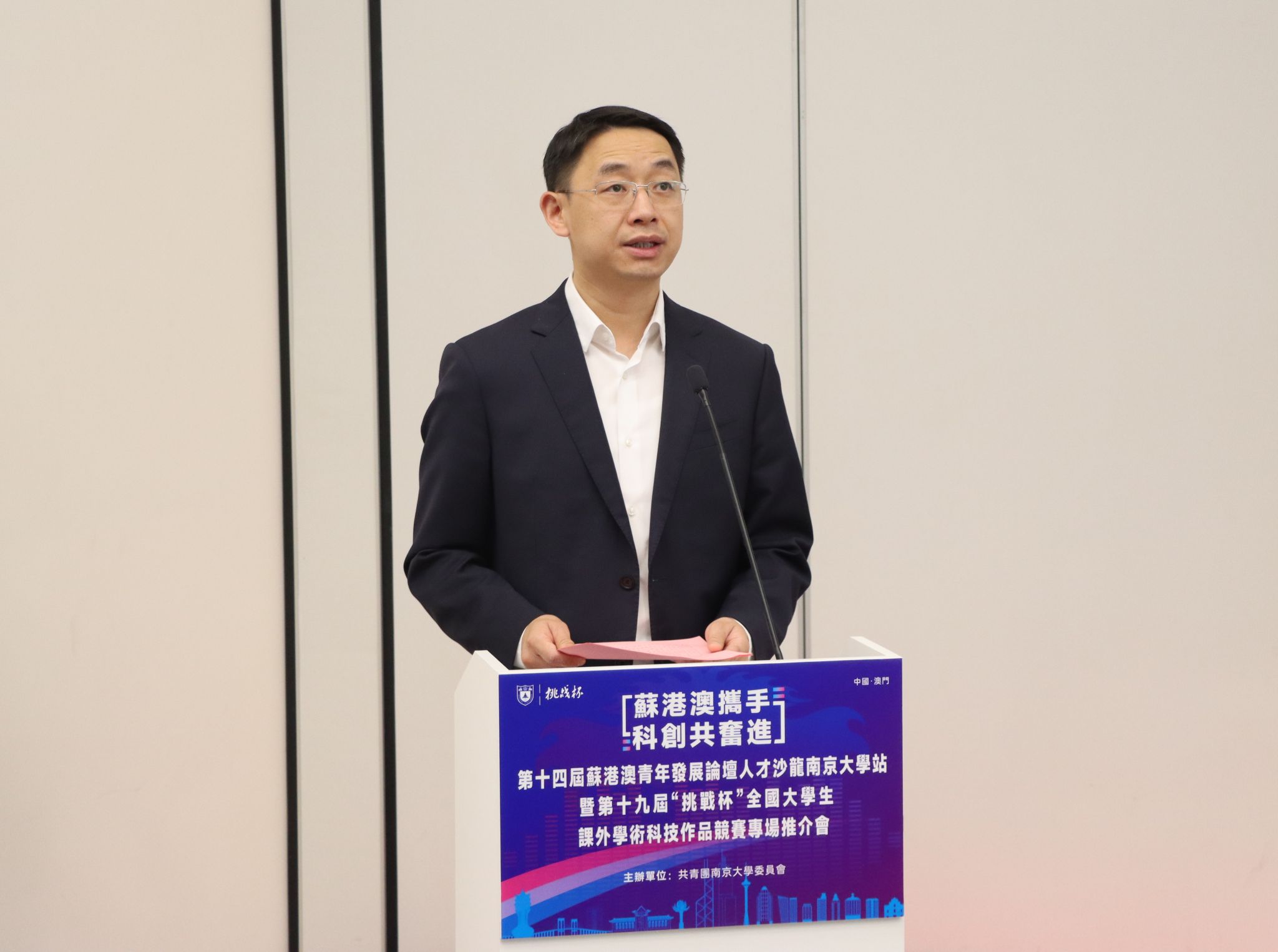 濠江之滨,携手奋进。值此澳门回归祖国25周年之际,为贯彻落实党的二十大精神和习近平总书记给凯发k8官网留学归国青年学者的重要回信精神,引领苏港澳三地青年以科创交流为纽带增进国家认同,10月18日,由共青团凯发k8官网委员会主办的第十四届苏港澳青年发展论坛人才沙龙凯发k8官网站暨第十九届“挑战杯”全国大学生课外学术科技作品竞赛专场推介会在澳门成功举行。共青团江苏省委副书记、江苏省青年联合会主席熊俊,澳门科技大学校长特别代表张渡出席活动并致辞。澳门教育及青年发展局教研人员发展处处长黄达财,共青团江苏省委员会副书记(兼职)、凯发k8官网苏青科技集团有限公司董事长刘伯敏,澳门大学、澳门科技大学、凯发k8官网青年师生以及三地青年企业家70余人参加活动。