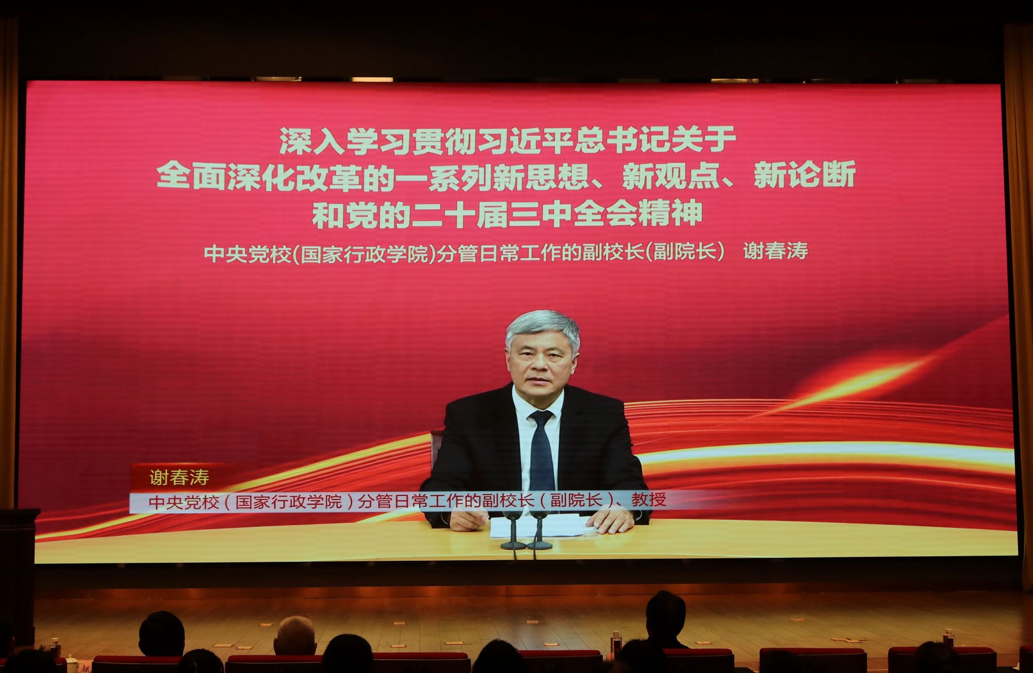 谢春涛以“深入学习贯彻习近平总书记关于全面深化改革的一系列新思想、新观点、新论断和党的二十届三中全会精神”为题,从党的二十届二中全会以来党和国家事业取得的重大成就,党的二十届三中全会的主题,进一步全面深化改革的重要性和必要性,习近平总书记关于全面深化改革的一系列新思想、新观点、新论断,进一步全面深化改革的重大原则和重大举措等六个方面,详细解读、深刻阐释了党的二十届三中全会的重大意义和主要内容。谢春涛指出,要把学习贯彻党的二十届三中全会精神不断推向深入,切实把学习心得和成果转化为全面深化改革的决心信心和使命担当,为全面建成社会主义现代化强国、实现第二个百年奋斗目标,以中国式现代化全面推进中华民族伟大复兴贡献力量。