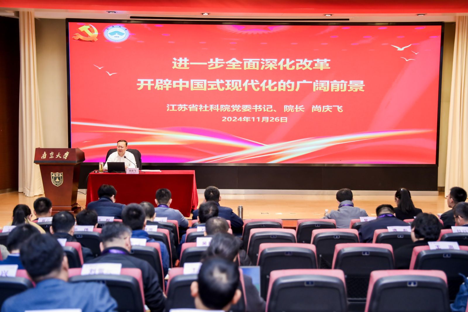 江苏省社会科学院党委书记、院长尚庆飞为培训班作题首场专题报告,报告题目为《进一步全面深化改革,开辟中国式现代化的广阔前景》。他从牢牢把握全会及其《决定》的重要大意义和主题、进一步全面深化改革的重要性和必要性、进一步全面深化改革的重大原则、进一步全面深化改革的重要举措、抓好全会精神贯彻落实的实践指向等方面对二十届三中全会精神进行了全面阐释。