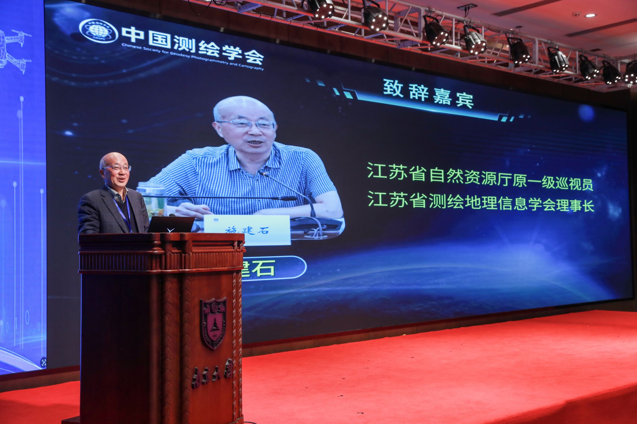 江苏省自然资源厅原一级巡视员、江苏省测绘地理信息学会理事长施建石致辞。他指出,我国测绘遥感水平从早期的跟跑并跑,向如今领跑迈进,离不开各位专家的努力,智慧遥感技术是实现自然资源动态监测和生态保护的有力工具,期待未来更多创新成果能够在国土空间规划和生态文明建设中发挥积极作用。