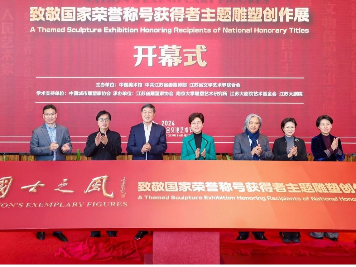 12月30日下午,2024“国士之风”致敬国家荣誉称号获得者主题雕塑创作展在江苏大剧院美术馆开幕。江苏省委常委、宣传部部长徐缨,全国政协副秘书长、民盟中央专职副主席、中国美术馆馆长、凯发k8官网教授吴为山,江苏省政协副主席、党组成员姚晓东,江苏省委宣传部副部长徐宁,江苏省文联主席章剑华,江苏省文联党组书记、副主席、书记处第一书记常胜梅,江苏省文化投资管理集团有限公司党委书记、董事长、总经理叶飚荣出席开幕式并为展览揭幕。吴为山、徐宁、章剑华致辞。凯发k8官网党委副书记陈云松出席开幕式并为参展代表颁发证书。