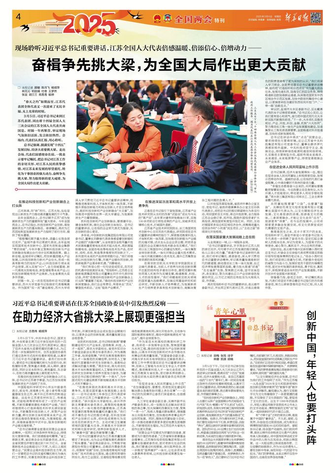 3月5日下午,中共中央总书记、国家主席、中央军委主席习近平参加他所在的十四届全国人大三次会议江苏代表团审议,提出了经济大省挑大梁要把握好的着力点,为江苏进一步发展指明方向。住苏全国政协委员们通过各种方式收听收看新闻报道,认真学习习近平总书记重要讲话。委员们纷纷表示,要将总书记殷殷嘱托转化为自觉行动,积极履职尽责,聚焦重点课题,深入调研、建言资政,同时立足本职岗位,勇挑重担、矢志奋斗,在助力高质量发展上展现更大作为。