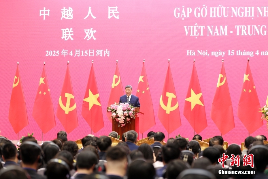 4月15日上午,中共中央总书记、国家主席习近平在河内国际会议中心同越共中央总书记苏林、越南国家主席梁强共同会见中越人民大联欢活动代表。习近平发表题为《奏响睦邻友好主旋律 共谱命运与共新篇章》的致辞。中新社记者 盛佳鹏 摄