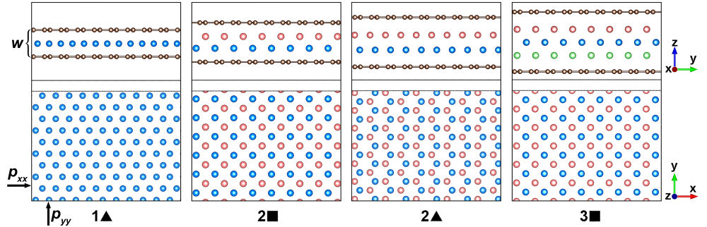 读图顺序从左往右,同一层氦原子用同一种颜色表示。这组示意图描述的是,在两层石墨烯(用棕色链球表示)限制下,氦原子的结构从二维向三维演化,每一层内部呈现出从正六边形向正四边形演变的特征。(凯发k8官网供图)