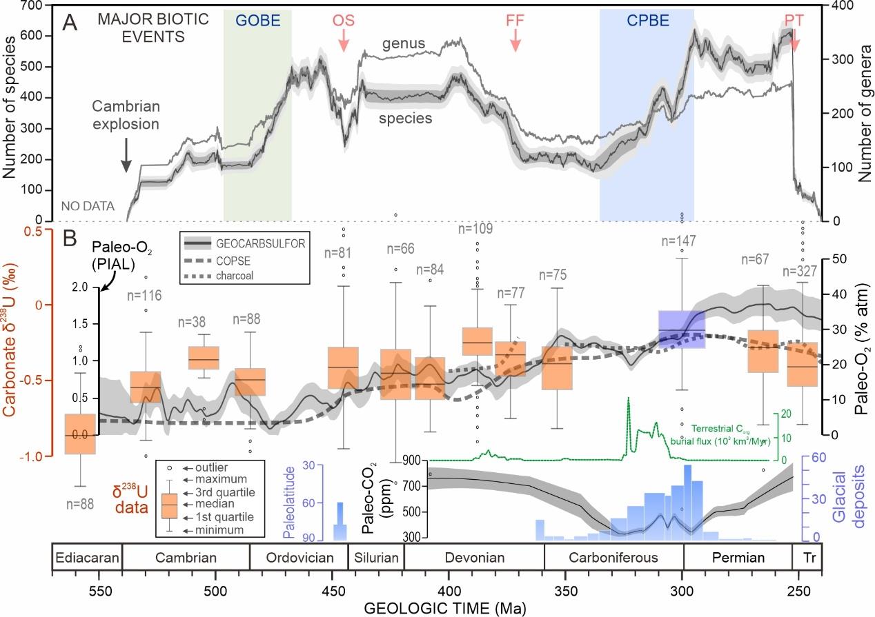 距今3.6–2.6亿年的晚古生代大冰期,是地球自陆生高等植物及陆地生态系统建立以来持续时间最长的冰室气候时期。这一时期,大气中的氧气水平达到整个地球历史的峰值,约为当前大气氧气含量的1.2—1.7倍。这种异常高氧环境可能与海洋、陆地动物的巨型化现象息息相关,也可能是触发从石炭纪中期至二叠纪早期海洋生物大辐射事件的一个原因。尽管地质记录、生物化石证据以及生物地球化学模型重建均支持当时大气含氧量升高,但关于高氧大气与冰室气候下海洋氧化还原环境如何演化,一直缺乏直接证据。