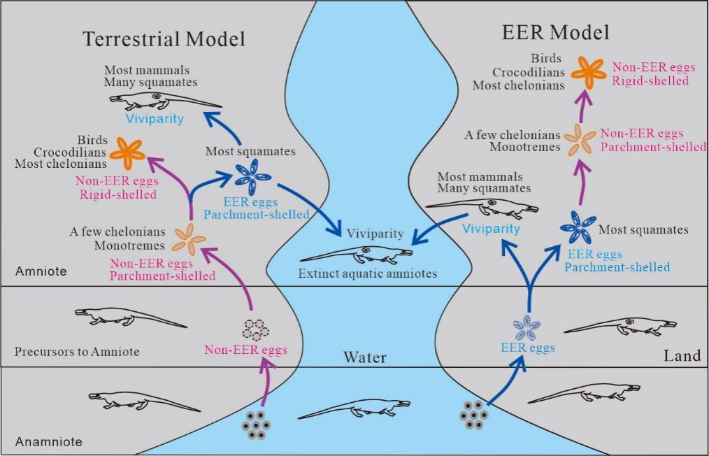 关于羊膜卵如何演化而来存在两种假说(插图1)。传统的陆地起源假说认为,羊膜动物的祖先可能像一些不经历变态发育的现生两栖类一样,开始在陆地上产卵。为适应陆地环境,羊膜动物的祖先逐渐演化出具有复杂结构的羊膜卵(羊膜卵先出现,俗称先有"蛋")。羊膜卵的出现使羊膜动物摆脱了对水环境的繁殖依赖,迅速在陆地上繁盛。这一被广泛接受的假说不时地被延长胚胎体内发育(Extended Embryo Retention,EER)假说挑战。延长胚胎体内发育假说认为,羊膜动物祖先登陆以后,为适应复杂的陆地环境,可能像很多现生蜥蜴和蛇一样保留胚胎在体内发育到一定阶段才产出卵或直接生出胎儿(胎生)。羊膜卵的复杂结构是为了便于与母体之间的物质交换,在羊膜动物的输卵管内逐渐演化出来的(羊膜动物先出现,俗称先有"鸡")。