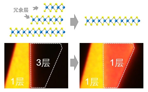 最后,团队还展示了该方法在化学气相沉积样品上的可行性。如图3,在适当的光照条件下,不仅可将双层WS2(在光致发光成像中显示为黑色区域)转化为单层(红色区域),而且还可将不均匀的单/双混合层WS2转化为纯净的单层,实现可控的冗余层移除。该技术为二维层状范德华半导体晶圆的厚度剪裁提供了一种简便的方案,用于解决二维电子学中面临的均匀性管理挑战,有望促进电子级范德华半导体晶圆的开发。