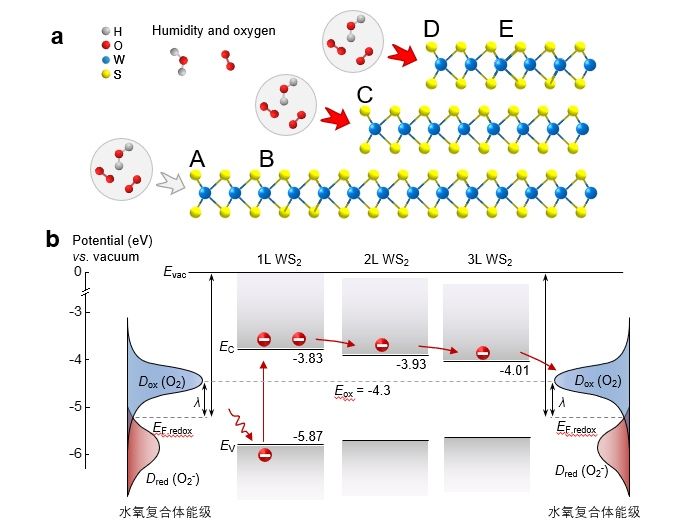 众所周知,由于量子限域效应,层状范德华半导体的能带与层数紧密相关,能隙一般随厚度增加而降低。对于同种材料而言,单层半导体的能隙往往比多层(≥ 2层)要大。如图2所示,光致的冗余层选择性剥离行为源于不同厚度半导体之间的能带漏斗效应 ——光生电子随内建电场(厚度差异诱导)从薄层往厚层定向传输,使得厚层优先被氧化刻蚀。图2a给出了包含1?3层(分别简写为1L、2L、3L)的不均匀WS2以及局部水氧刻蚀的示意图,每层的边缘和中心等5处典型区域分别用字母A?E标示。图2b给出了不同厚度区域的能带及排列图,由于能带随厚度增加而减小,导带随厚度有序排列,即厚度越大能带越低,形成电子定向传输的“能带漏斗”。在光辐照条件下,受激电子从价带激发至导带后,倾向于从导带的高能级上定向输运至低能级,形成受激电子的定向传输,因此在厚层附近会富集受激电子,氧化反应(光刻蚀)速度更高。考虑到边缘悬挂键等因素,A?E处的反应速率满足如下关系:D > C >> A,形成不同位置间巨大的反应速率差异,最终表现为厚膜顶部的冗余层随着边缘被优先刻蚀,即光致剥离现象。