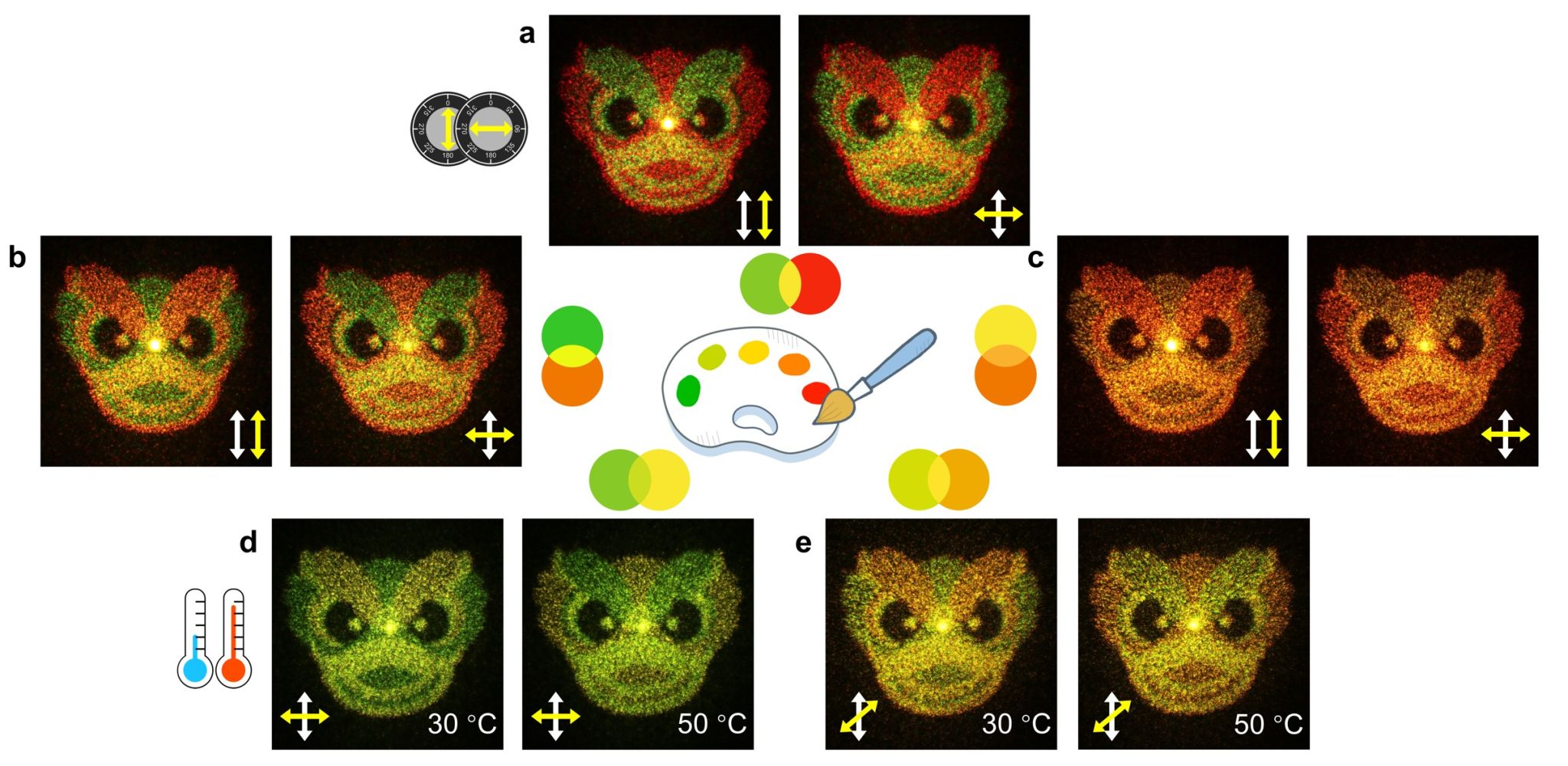 反射式旋光色散效应自然地连接了光的偏振和波长维度,为实现偏振、波长混合复用的动态全息拓展了新思路。多色光入射双手性液晶超结构时,反射光的线偏振方向会随波长有规律地旋转,并在550~605 nm的波长范围内旋转了360°。该物理效应在反射光偏振方向和波长之间建立起一对多的映射关系,因此,固定的检偏片滤出的舞狮全息图像会随波长交替变化(图2g)。进一步地,若同时入射多个波长的光,就可以混合出炫彩的舞狮全息图像(图3)。基于反射式旋光色散的动态可调性,偏振片旋转和外场刺激均能改变这些全息图像的颜色,实现“全息彩绘”的动态上色,充分验证了该方案在动态多色光复用方面的潜力。