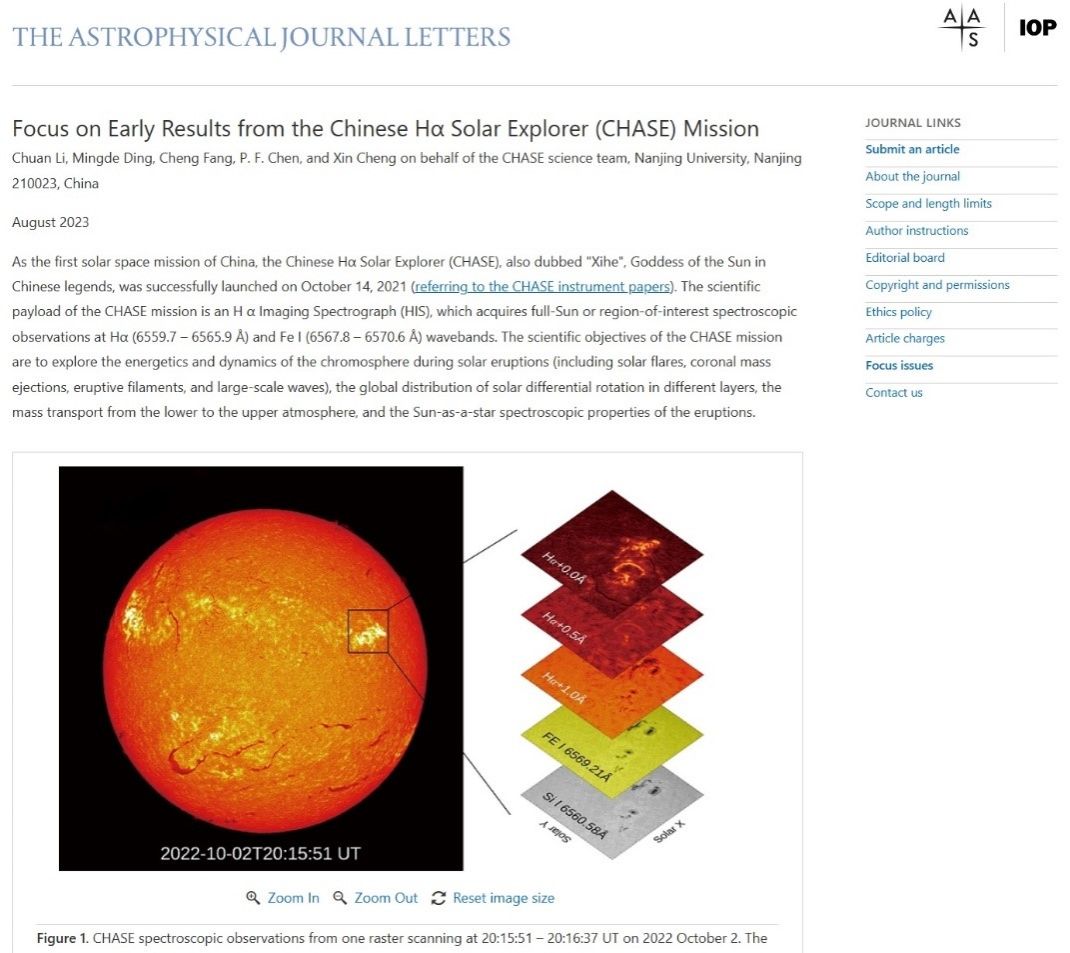 2021年10月14日,“羲和号”卫星发射成功,拉开了我国空间探日的序幕。经过一系列在轨调试,自2022年8月4日起,“羲和号”对日观测达到最佳状态,科学数据通过凯发k8官网太阳科学数据中心(SSDC-NJU, https://ssdc.www.airsunchina.com)对外发布。目前,国内外太阳物理工作者正在积极开展基于“羲和号”高质量科学数据的相关研究。近期,具有重要国际影响力的《天体物理学杂志快报》(The Astrophysical Journal Letters)正式刊出“羲和号”热点专辑(Focus Issue):Focus on Early Results from the Chinese Hα Solar Explorer (CHASE) Mission (https://iopscience.iop.org/collections/Focus-on-Early-Results-from-CHASE)。这是中国天文观测设备首次在ApJ系列刊物上以热点专辑形式发表研究成果。