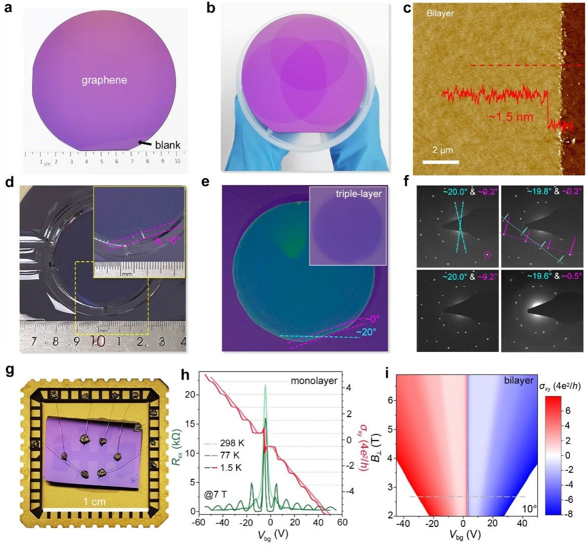 图2. 晶圆级单层和多层石墨烯薄膜。a,转移至SiO2/Si衬底的4英寸石墨烯的照片,薄膜宏观均匀,仅能从空白区域区别;b,叠层转移至SiO2/Si衬底的三层4英寸石墨烯的照片,薄膜宏观均匀;c,双层石墨烯的原子力显微镜高度图,样品均匀超洁净,高度约1.5纳米;d,宏观堆垛角度控制过程,调整角度为~0°;e,获得具有固定堆垛角度的三层石墨烯;f,随机测量的SEAD图,扭转角和宏观堆垛角基本吻合,插图为一阶和二阶SEAD斑点的相对强度;g,厘米级石墨烯霍尔器件的照片;h,厘米级器件的量子霍尔效应;i,双层石墨烯,霍尔电导σxy的二维等值线图,在1.5 K和磁场强度大于2.7T时既可出现朗道能级。
