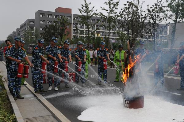 消防知识培训结束后,新生在教官、老师以及领导的指挥下,在学生宿舍楼进行了火灾现场灭火及逃生实地演练。在01幢宿舍门前,燃起两堆熊熊大火,制造漫天的烟雾,模拟出一个逼真的火灾现场。在出现火灾后,同学们首先进行了报火警。然后,由新生及保安队员组成的志愿消防队赶赴火灾现场,将火扑灭。火灾警报拉响后,志愿消防队员冲进火灾现场组织同学们进行了快速有序的疏散,闻讯起来的医护人员也进入火场对受伤人员进行救治。