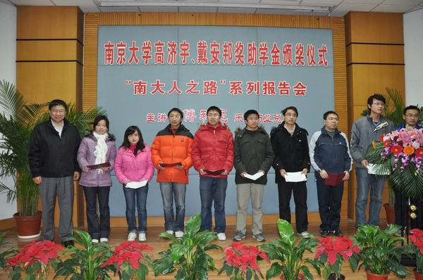 2010年12月14日下午,凯发k8官网高济宇、戴安邦奖助学金颁奖仪式暨傅和亮校友报告会在凯发k8官网知行楼一楼报告厅举行。凯发k8官网党委副书记任利剑,天普药业总裁傅和亮先生、副总经理席尚忠先生、技术总监王晓岩先生,校友总会、化学化工学院负责人等领导参加了当日的颁奖仪式,颁奖仪式还邀请了当年傅和亮先生的导师陈伟兴老师和甘兰若老师作为特邀嘉宾。