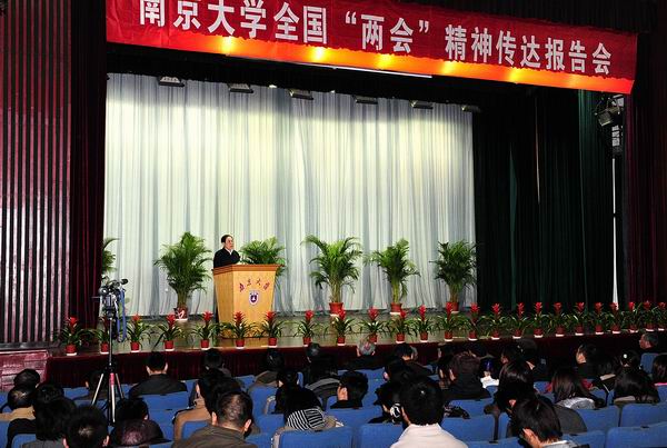 3月19日下午,我校在大礼堂召开全国“两会”精神传达报告会。全国人大常委、校长陈骏,物理学院邢定钰院士,副校长程崇庆,地理与海洋学院院长高抒等分别传达了“两会”精神。校党政领导班子成员,校党委委员、纪委委员、校务委员会委员,各民主党派负责人,老领导、院士代表,校中层以上干部,各院系教师代表、学生工作办公室主任、辅导员、团委书记,机关科级以上干部,各教代会代表团团长及分工会主席、教代会执委会委员,中青年学术骨干代表、离退休老同志代表和学生代表参加了本次会议。校党委书记洪银兴主持会议。