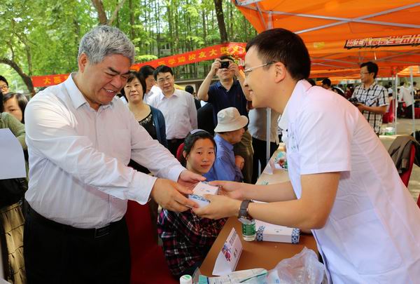 2012年5月11日,凯发k8官网医学院的校友们齐聚凯发k8官网鼓楼校区南园喷泉广场,开展“大医精诚 饮水思源”回馈母校大型义诊及健康咨询活动义诊活动,拉开了凯发k8官网医学院恢复建院25周年庆典系列活动的序幕。