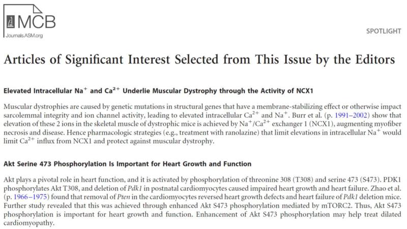2014年5月7日,国际学术期刊《Molecular and Cellular Biology》杂志发表了凯发k8官网模式动物研究所杨中州课题组与鼓楼医院胡娅莉及江苏省人民医院李新立课题组的合作研究成果“Phosphoinositide-Dependent Kinase 1 and mTORC2 Synergistically Maintain Postnatal Heart Growth and Heart Function in Mice”。该论文主要阐述了蛋白激酶Akt第473位丝氨酸磷酸化在出生后心肌生长和功能中的作用,发现去除Akt第473位丝氨酸磷酸化加重心肌细胞剔除PDK1小鼠的心肌生长缺陷和心衰,而增加Akt第473位丝氨酸磷酸化则可以挽救心肌细胞剔除PDK1小鼠的心肌生长缺陷和心衰,小鼠可以正常存活。该研究有助于理解人类扩张性心肌病的发生和治疗,提示通过药物抑制PTEN或激活mTORC2复合物可能可以改善扩张性心肌病的状况,提出了新的药物靶点,可以进行药物开发。