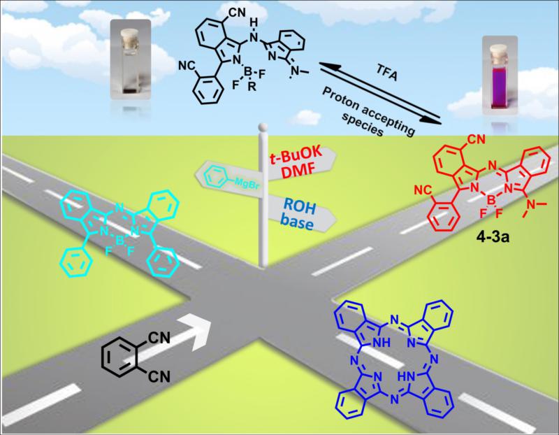 邻苯二腈化合物已经被广泛用于合成酞菁以及对称苯并aza-BODIPY化合物,该工作表明它们还可用于合成不对称的苯并aza-BODIPY化合物,进一步拓宽了邻苯二腈化合物的应用范围。同时,不对称D-π-A型苯并aza-BODIPY具有奇特的变色性质,将激发人们对这一类新化合物的研究兴趣。