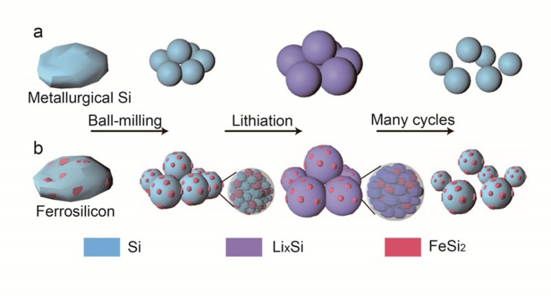 为了低成本并且方便的获得硅纳米颗粒负极,该课题组着眼于工业生产中的粗硅源(铁硅,金属硅),通过高能球磨的方法控制时间及转速获得不同尺寸的硅颗粒(大至100 um,小至100 nm),系统研究了两种不同硅源作为电极的优势(铁硅自身可抑制循环中的膨胀,金属硅有更高的容量及导电性),并且在以制得的100 nm左右的颗粒作为电极材料时获得了很好的循环及倍率性能。整个过程简便且大大降低了成本,为大规模生产硅纳米颗粒,制备硅负极提供了新思路,并且也为硅在光伏,热电领域的制备合成提供了新方法。该论文的通讯作者是现代工程与应用科学学院朱嘉教授,第一作者是现代工程与应用科学学院硕士研究生朱斌和金艳,项目研究得到了国家重点基础研究项目,国家自然科学基金和江苏省优势学科资助。