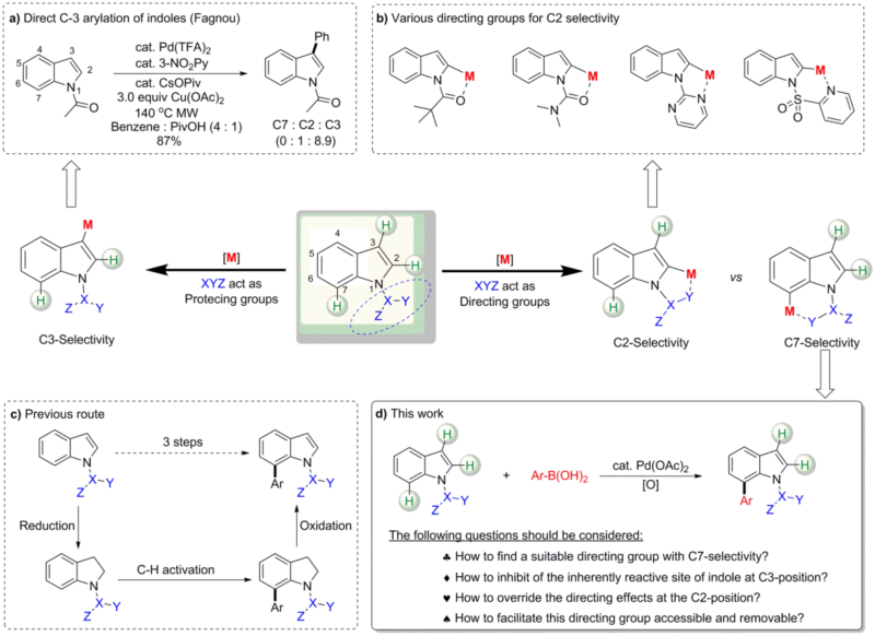近年来, 利用过渡金属催化的C—H 键官能团化反应来进行吲哚骨架的修饰受到化学家们的广泛关注。由于吲哚本身的芳香性,其3号位比较容易发生亲核反应,例如2007年,已故的加拿大化学家K. Fagnou教授在Science(2007, 316, 1172.)上报道的钯催化吲哚3号位的C—H芳基化反应 (图一,a)。吲哚2号位的官能团化一般需要借助氮原子上的导向基团,通过与金属催化剂配位形成金属五元环中间态,实现该位置的活化,常见的基团有酰基、脲、嘧啶等(图一,b)。选择性的在吲哚7号位上发生官能团化很难,主要是由于导向基团(XYZ)和金属作用在2号位形成五元环的趋势远远大于在7号位形成六元环,因此只要有2号位的存在,7号位基本不能实现官能团化。间接可行的方法是,先将吲哚还原成吲哚啉,除去2,3号位置的干扰,然后进行官能团化,这时只能在7号位反应,得到的产物再经过氧化,可以得到相应的吲哚产物(图一,c)。因此要实现直接选择性的7号位C—H官能团化,必须考虑以下几点:1)需要找一个合适的导向基团;2)如何抑制3号位固有的反应活性;3)如何控制导向基团选择性的只对7号位作用;4)如何将该导向基团顺利的从产物中除去(图一,d)。