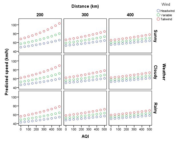 空气污染,尤其是雾霾污染,对人类和其他动物的健康都造成了严重的影响。环境卫生机构建议,在雾霾天气中人们应该减少户外活动以降低对身体健康的损伤。然而,动物在行为上如何应对雾霾污染,人们却知之甚少。该研究收集了我国空气污染最严重的京津冀地区的415场赛鸽数据以及相应的空气、天气等变量,通过多元线性回归建立了空气污染与信鸽飞行的回归模型。通过模型模拟,团队研究人员发现雾霾污染越严重,信鸽飞行越快。在控制了归巢距离、天气、风力风向等因素下,信鸽在空气质量指数AQI=0时飞行时速为55.6km,而当AQI=500时其飞行时速增加22.7%,达到68.2km。