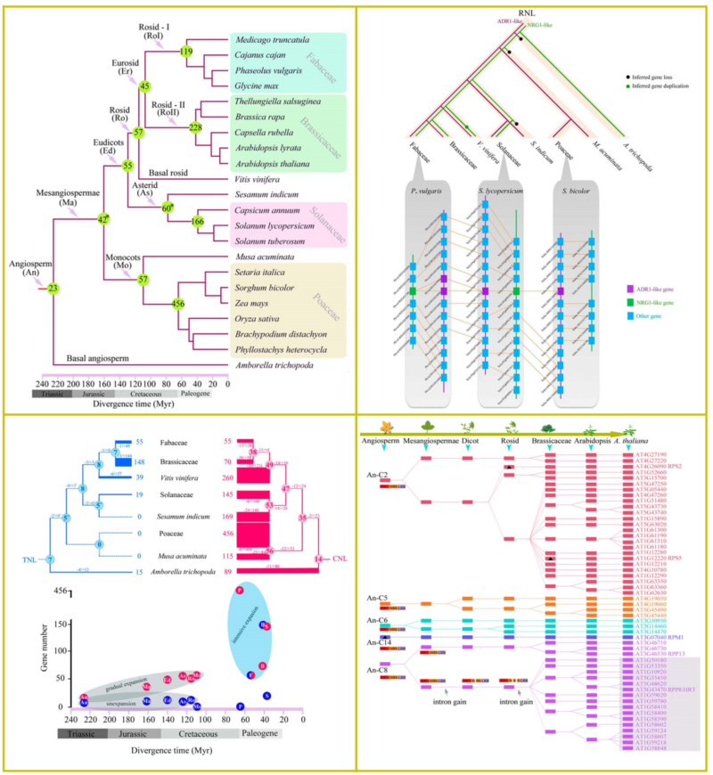 在该论文中,团队研究人员对植物最大的一类抗病基因——NBS-LRR基因在被子植物中的演化模式进行了研究。通过对22个被子植物基因组中鉴定出的6000多条NBS-LRR基因进行系统演化分析,提出了NBS-LRR 基因划分的新体系;从被子植物演化尺度上揭示了该类基因的演化历史、演化模式及机制。结果发现:1)NBS-LRR基因包括三个古老的亚类:TNL、CNL和RNL。作为参与抗病信号传导的基因,RNL呈现出保守的演化特征;而直接参与病原识别的TNL和CNL基因则展现出不同的扩张模式;2)在白垩纪和第三纪过渡期(K-P boundary)的真菌爆发可能是NBS-LRR基因剧烈扩张的一个重要诱因;3)对功能基因演化历程的追溯揭示了植物与病原间的长期“军备竞赛”。