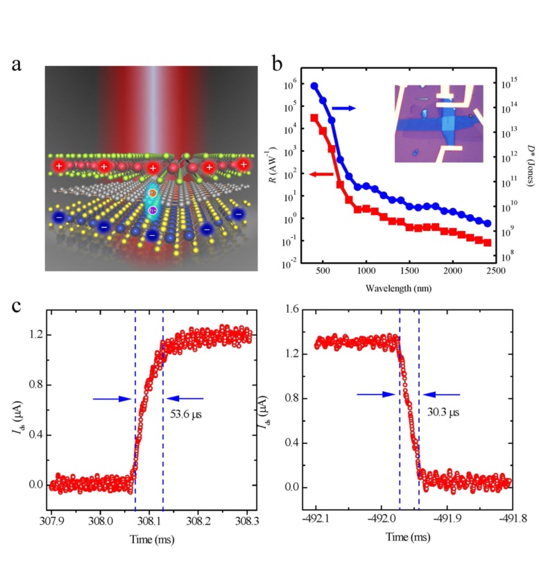 这项工作创造性地设计了一种被称为“p-g-n”的新型范德瓦尔斯异质结,即选取两种不同掺杂的半导体二维材料(p型和n型)和石墨烯(g),将石墨烯作为中间层堆垛实现原子层厚度的三明治结构(图a)。该结构中,原子层厚度p-n结因为强内建电场的存在,可以有效降低暗电流和提高响应速度;石墨烯因为具有零带隙和线性色散关系,能够有效实现宽波段吸收。在实验上,按照上述器件设计思路,这项工作结合机械解理、定向转移及微纳加工工艺,得到了高质量具有原子级平整界面的WSe2 (p型)-graphene (g)-MoS2(n型)异质结探测器器件,并观测到非常优异的性能(图b)。在可见光波段的激光照射下,p-g-n异质结探测器光电响应率达到4250 A/W,比探测率达到1015 Jones;在近红外波段和通信波段,响应率达到安每瓦的量级,比探测率达到1011Jones的量级,并在室温下实现了2.5 um的红外波段探测。此类探测器也表现出非常快的响应速度,实验分别观察到53.6us的上升时间和30.3us的下降时间(图c)。