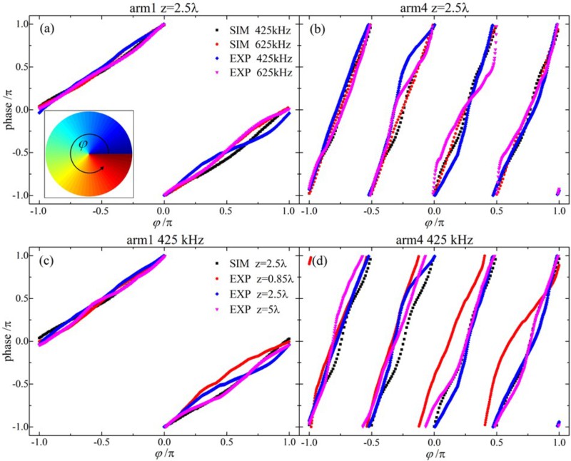 图2为具有不同拓扑数的声涡旋场发射器的原理示意图,以及所产生的涡旋场的相位、声强分布图。图3为不同频率及不同传播距离上涡旋场相位分布的实验、仿真结果对比图,显示该设计能够在宽频带、长距离内产生拓扑数稳定的声涡旋场,且其拓扑数可灵活控制。