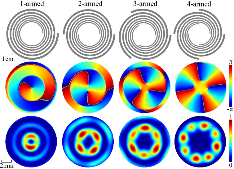 图2不同拓扑数的声涡旋场发射器原理示意图(第一行)、声场相位分布图(第二行)及声强分布图(第三行)。