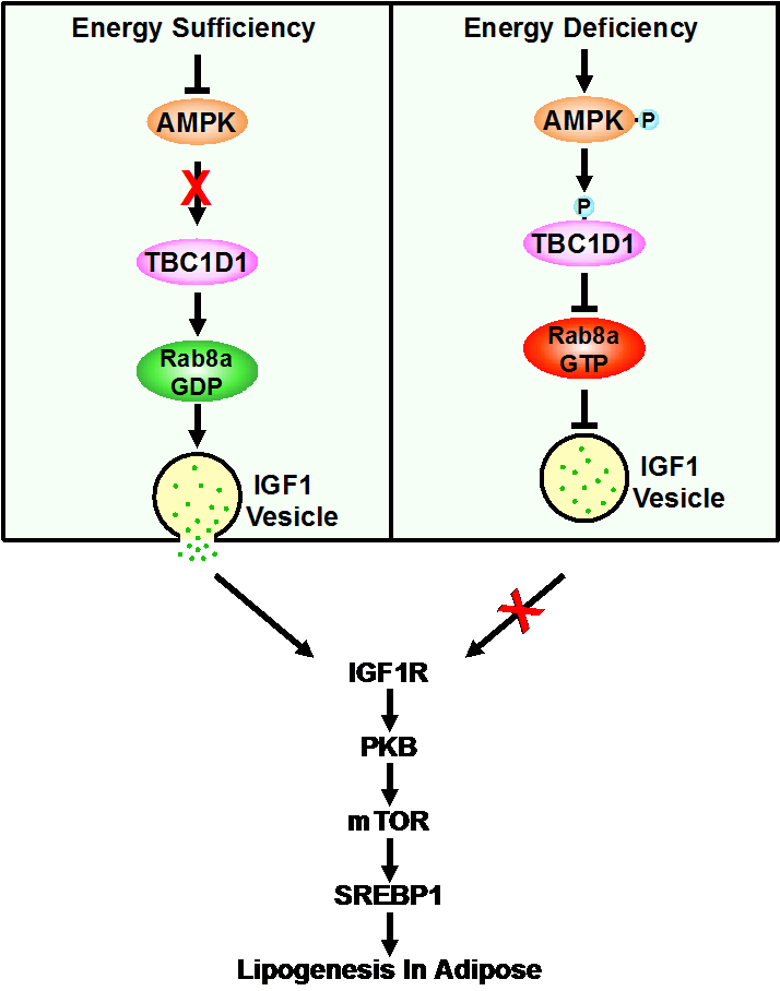 图一:AMPK-TBC1D1-Rab8a-IGF-1通路在体内能量状态感知与肥胖发生中作用机制示意图