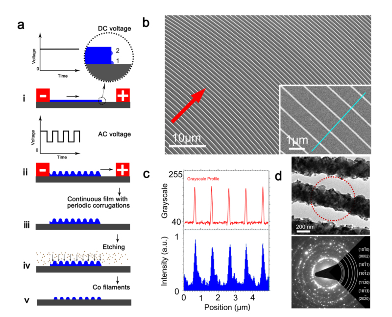 图一、超薄电化学沉积系统得到钴纳米线阵列示意图及形貌、结构表征