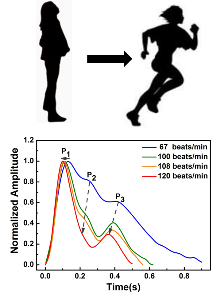 该研究采集了不同测试对象或运动前后的脉搏信号,用于评估心血管系统的即时状态。对常用血管扩张药物(硝酸甘油)进行的动物试验表明,药物导致脉压和心率的波动。研究的下一步目标是即时信号的远程传输,结合专门的手机App,实时收集与上传用户的健康数据,建立个性化的健康档案,实现在线评估心血管系统,从而定制合适个人的健身和心脏药物服用计划。该材料的研究曾入围2016春季Materials Research Society(美国材料研究学会)iMatSci的二十个参展项目。