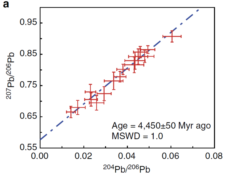 地科院张爱铖教授在研究一块来自小行星带外缘天体的球粒陨石样品(DaG 978)时,观察到了大量磷灰石颗粒。他们通过详细的矿物学和微量元素地球化学研究(图1和2),揭示了DaG 978中的磷灰石是流体蚀变成因的,不同于常见的热变质成因磷灰石。通过与中科院地质与地球物理研究所的年代学专家合作,张爱铖教授使用先进的离子探针测试了这些磷灰石的U-Pb同位素体系,从而获得了磷灰石的绝对年龄为4450 Ma(图3)。这是太阳系早期流体活动的第一个有效绝对年龄。不同于前人相对年龄的结果,这个绝对年龄说明太阳系形成早期的流体活动可延续120 Myr左右,而不是只持续25 Myr左右。