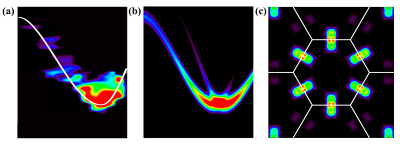 图1. (a) 实验测得的磁色散能谱,白线是(b)图中的理论计算结果;(c) 磁激发谱在动量空间的计算结果。