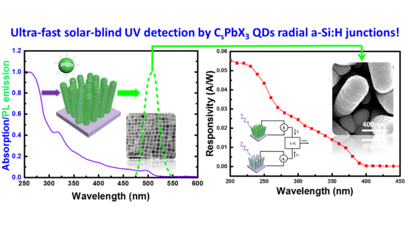 紫外日盲探测是环境监控、火焰探测和远程预警响应等应用的核心技术。目前,绝大多数紫外日盲探测器件基于昂贵且的III-V 族晶体材料。如能利用大面积、低成本的硅基薄膜技术制备灵敏的深紫外探测,将有助于提升日盲光谱信号空间探测与成像的分辨率,大幅降低器件应用成本,并推动其在安全环境监控领域的广泛应用。由于硅基薄膜和透明导电层(如ITO薄膜)对深紫外信号的吸收非常强,在通常的硅基p-n或p-i-n结区光电结构中,日盲光子信号根本无法穿透表面的ITO导电层或者重掺杂硅层从而到达在光电活性的本征i层实现有效的光电吸收与探测。一个有效的途径是在器件表面将高能光子吸收,然后剪裁转化(down-conversion)为较低能量的光子信号进入硅基p-n结区实现探测。为此,凯发k8官网余林蔚教授课题组与凯发k8官网师范大学徐翔星教授课题组共同探索了一种新颖高效的无机铯系钙钛矿量子点(Inorganic perovskite CsPbX3 , X = Cl, Br, I, or hybrid quantum dots, IPQDs)与硅纳米线径向结(Silicon Nanowire Radial p-i-n Junction)杂化薄膜日盲探测器件构架,其中IPQDs量子点具有优异的紫外光电吸收和量子转化效率。将其均匀布置在三维(3D)构架的硅纳米线径向结薄膜电池结构的表面,可将日盲信号直接转化为径向非晶硅p-i-n结区最优化波长(~500 nm附近)实现灵敏吸收探测。而3D构架径向结中特有的强陷光和近场增强效应对于实现高效的IPQDs光电转换也至关重要,另外,针对快速探测需求,径向结中本征结区厚度可从平面结的300 nm降到仅仅80 nm优化,从而有利于光生载流子的快速吸收和响应。基于此技术,最终实现了可大面积低成本制备和应用的硅基薄膜日盲探测器件:在200 nm深紫外获得了>50m A/W的响应度,目前已经实现了较快的日盲光电探测(上升和下降时间沿为0.48 ms/1.03 ms),并还有较大进一步提升空间。同时,由于采用无机铯西量子点结构,探测器件不需要特殊封装即可稳定工作1000小时以上,从而将大面积硅基薄膜光电应用成功推进到通常为小面积III-V族(如GaN等)半导体所垄断的日盲探测领域,为大幅度降低成本和规模化应用推广奠定了关键基础。