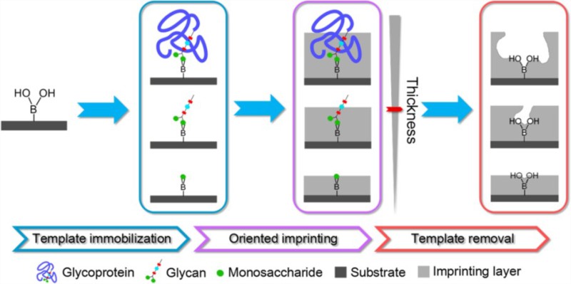 分子印迹是制备具有类似抗体或酶专一性仿生识别材料的重要技术,在生物传感、亲和分离和疾病诊断等领域具有广阔的应用前景。但是,蛋白质等生物分子的普适、高效印迹是分子印迹中的一个重要的挑战,传统方法难以同时满足不同大小的生物分子的印迹,更难以对印迹过程进行精确控制。经过多年在硼亲和材料(Chem. Soc. Rev. 2015, 44, 8097-8123; Angew. Chem. Int. Ed., 2009, 48, 6704-6707; 2015, 54, 6173-6176; Chem. Sci., 2012, 3, 1467-1471; 2013, 4, 4298-4303; 2014, 5, 4065-4069)和分子印迹(Angew. Chem. Int. Ed., 2013, 52, 7451-7454; 2014, 53, 10386-10389; 2015, 54, 10211-10215 (VIP); Chem. Sci., 2014, 5, 1135-1140;Anal. Chem., 2016, 88, 1447–1454 (ACS Editors' Choice))领域中的深入研究,该研究团队发展出硼亲和可控定向表面印迹法。该方法能够便捷高效地制备出糖蛋白、聚糖和单糖的分子印迹聚合物。该方法的原理见图1,先将模板分子固定到硼酸功能化的基质上,然后利用生物相容性良好的功能单体在基质表面聚合,形成合适厚度的印迹层以及与模板分子空间匹配的印迹腔。该方法的最大优势在于印迹可控性:根据模板分子尺寸大小,调整印迹层厚度,制备出不同尺寸模板的分子印迹聚合物,而印迹层厚度只需要调节印迹时间来精确控制。这不仅简化了印迹步骤,而且适用范围广。所得分子印迹聚合物已经在疾病诊断(Anal. Chem., 2014, 86, 959-966;2014, 86, 12382-12389;2016, 88, 12363-12370)、癌细胞靶向识别(Chem. Commun., 2015, 51, 17696- 17699;Sci. Rep., 2016, 6, 22757)和活体单细胞分析(Angew. Chem. Int. Ed., 2016, 55, 13215-13218)等重要应用领域中展现出优越的分子识别性能。