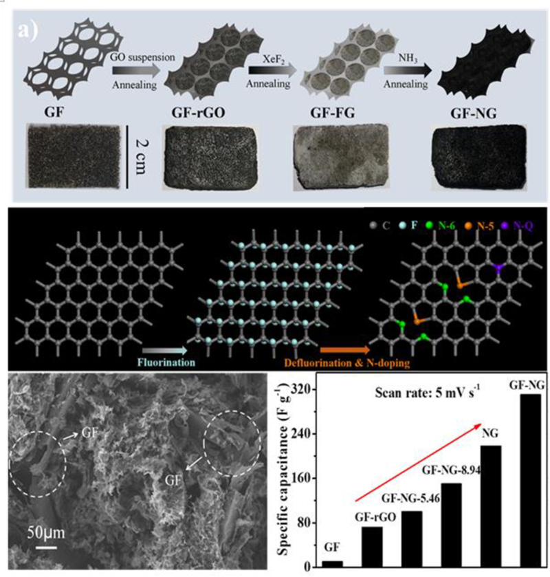 石墨烯由于其独特的物理和化学性质,被广泛的应用到超级电容器领域。一般来说,作为性能优越的电容器材料,要求该材料具备大的比表面积、高的导电性、高的活性位点和良好的浸润性。目前,为了克服石墨烯在制备过程中容易坍塌而导致暴露在电解液中的有效的比表面大大降低的不足,研究人员致力于制备三维石墨烯多孔材料。然而,化学自组装方法制备的三维石墨烯多孔材料导电性差, CVD方法制备的石墨烯三维网络虽然导电性好,但缺乏活性位点和好的浸润性。近年来,氮掺杂被大量实验证明能有效提高石墨烯的活性位点和浸润性,进而改善其超级电容器性能。但是,相比于化学剥离法制备的含有大量缺陷的石墨烯纳米片,CVD方法制备的三维石墨烯网络高的结晶质量使得氮掺杂异常困难。本研究在中科院金属所合作团队提出的石墨烯网络/氧化石墨烯气凝胶嵌套杂化网络结构基础上(Advanced Materials 28, 1603, 2016),合作团队借助于轻质元素超掺杂技术,设计并合成一种氮掺杂量高达12 at%的氮元素超掺杂三维石墨烯网络。结果表明,该三维体系同时具备高的导电性(3.33 S cm-1)、大的比表面积(583 m2 g-1)、丰富的活性位点与良好的浸润性。基于该材料制备的电容器具有高达380 F g-1的比电容、长久的循环寿命(4600次循环充放电衰减为6.3%)及高的功率密度等优异性能。