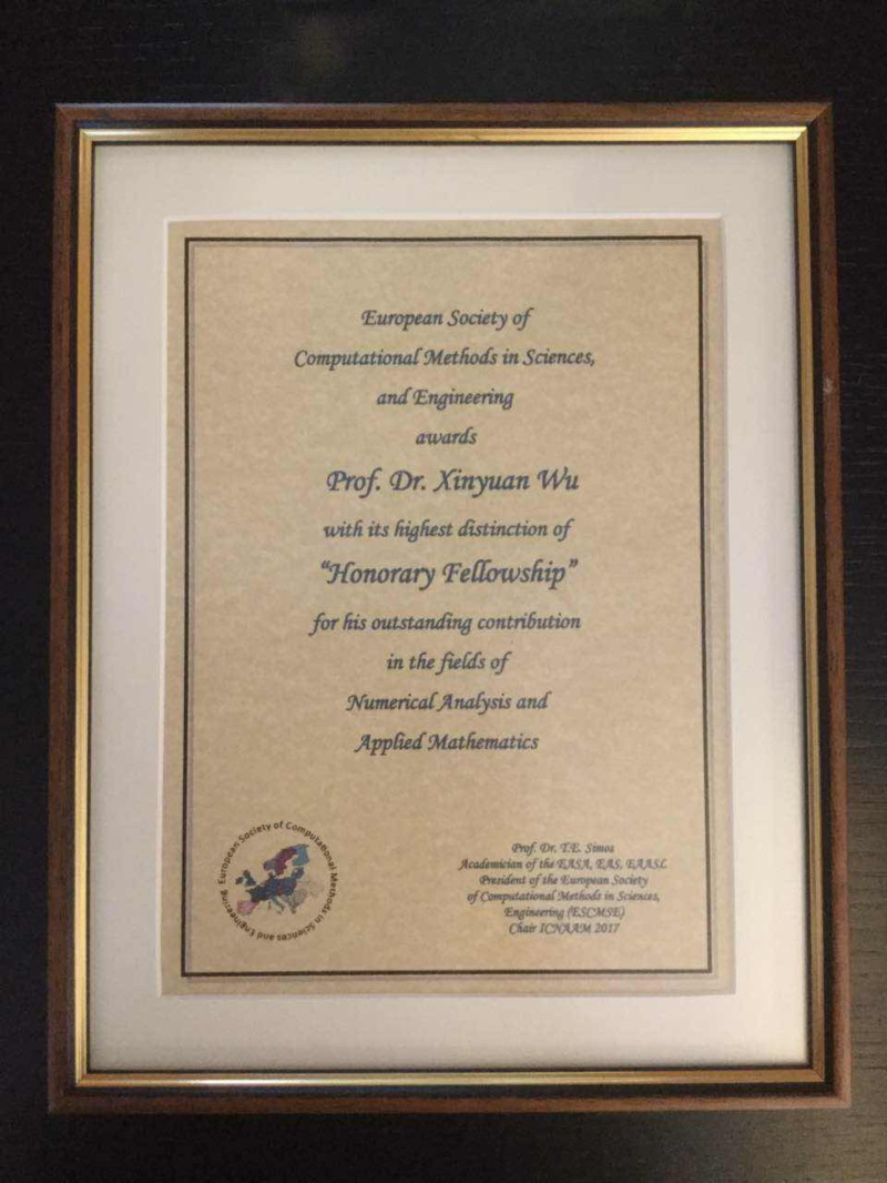 2017年9月25-30第十五届数值分析与应用数学国际会议(ICNAAM 2017)在希腊召开,我校数学系吴新元教授应ICNAAM 2017组委会的邀请在会上作题为“ERKN Integrators Solving Multi-Frequency Highly Oscillatory Systems with Applications”的一小时大会特邀报告,报告内容从课题组发现的矩阵常数变易公式到算子常数变易公式,从多频高振荡非线性常微分方程组到高维非线性波动方程,从保系统的物理结构到几何结构,从具体的保结构算法到误差分析,充分反映了凯发k8官网振荡微分方程保结构算法课题组近十年来的最新研究成果。会议期间举行了隆重的颁奖仪式,我校吴新元教授荣获欧洲科学与工程计算方法学会2017年度颁发的最高荣誉奖“Honorary Fellowship”,该奖项是表彰获奖者在数值分析与应用数学领域所做出的杰出贡献。