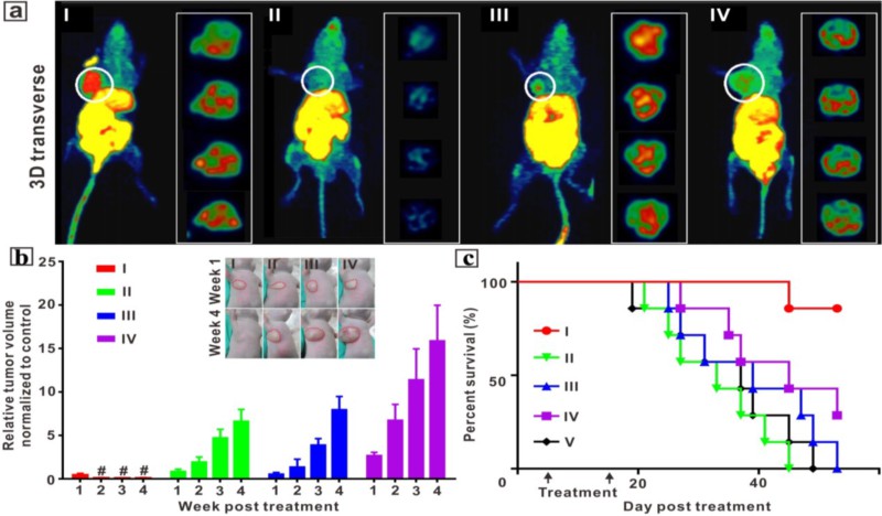 体内研究发现,高转移性的乳腺癌肿瘤模型经放疗后,肿瘤生长受到明显抑制,荷瘤小鼠生存期明显延长(图2b,c),同时肿瘤细胞向肺部和肝部转移也得到很好控制。此外,该纳米聚集体对放疗不敏感的胰腺癌也具有良好的放疗增敏作用(图3)。经光热治疗/放疗联合治疗,胰腺肿瘤体积明显缩小,且相关的生化因子显示,联合治疗后,血液中的炎症因子和相关肿瘤指标数值明显降低,展示出良好的抗肿瘤效果。相关成果“Hypoxia-Targeting, Tumor Microenvironment Responsive Nano-Cluster Bomb for Radical-Enhanced Radiotherapy”已在线发表在ACS Nano(DOI:10.1021/acsnano.7b04737)。霍达博士为论文第一作者,周正扬教授和胡勇教授为该论文的共同通信作者。