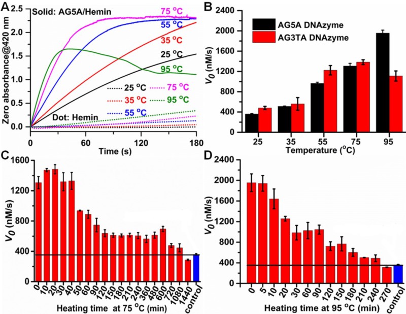 由于蛋白质的温度敏感性,蛋白酶的催化性能与温度相关,在应用上受到很大的限制。寻找、发现能够在极端环境如高温下仍具有高催化能力、高稳定性的仿生模拟酶具有十分重要的意义。近年来,具有催化活性的纳米结构材料和G-四链体/hemin DNA模拟酶受到广泛关注,已成为新型仿生模拟酶开发的重点方向。在G-四链体/hemin领域,由分子内G四链体/hemin形成的DNA模拟酶已在生物催化、生物传感等领域得到广泛应用,但其热稳定性差,无法用于极端环境。基于四条链形成的四元G四链体具有很好的热稳定性,鞠熀先教授研究组通过对四元G四链体的末端进行碱基修饰,并对反应的离子进行筛选,提高hemin和四元G四链体的结合能力,发现了一种新型嗜热的高活性G-四链体/hemin DNA酶(图1)。该工作在四元G四链体的末端修饰上不同的碱基,发现腺嘌呤(A)可以大幅度的提高DNA酶的催化活性,为提高反应温度进行模拟酶催过功能如活化能、pH依赖性等的研究奠定了基础。末端修饰腺嘌呤的四元G四链体结构在高温下不仅可以稳定存在,也可保持与hemin的结合能力及形成模拟酶后的催化活性(图2)。该工作探索了该嗜热DNA酶在高温下的潜在应用:可以有效地去除污水中对人体有害的有机小分子,在不同的有机溶液中该酶也同样具有高的催化活性。