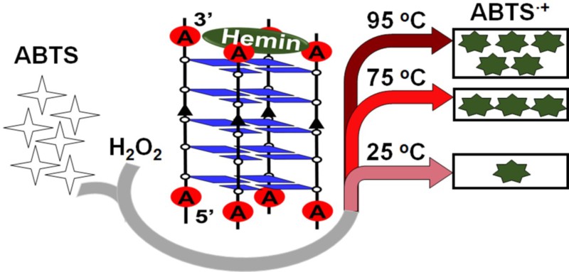 图1. 嗜热G-四链体/hemin DNA酶在不同温度下催化底物反应的示意图