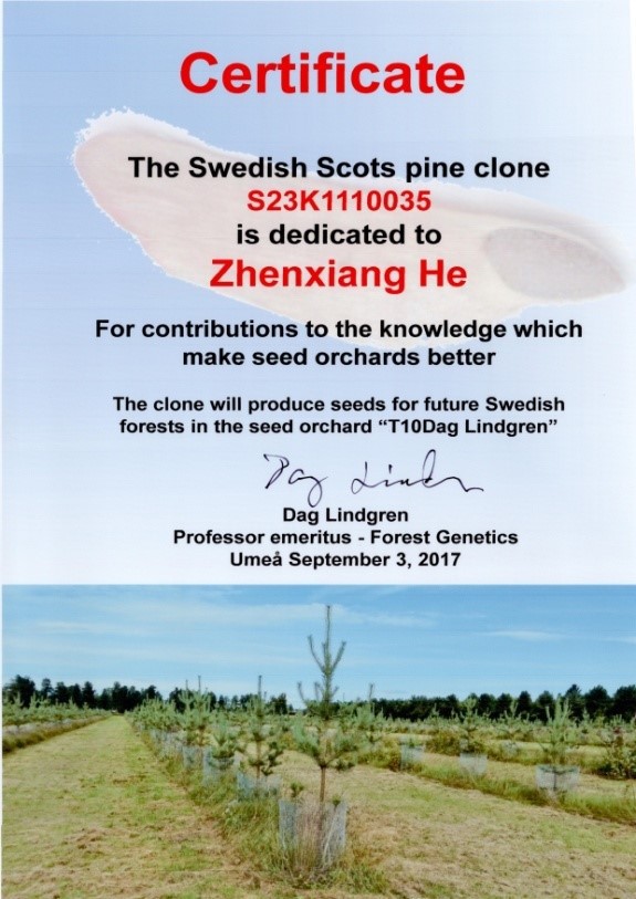 凯发k8官网生命科学学院何祯祥副教授课题组、广东省林业科学研究院以及广东省乐昌市龙山林场研究团队运用自身在中国南方重要造林乡土树种—杉木多世代遗传改良研究领域的多年积累和经验,创新性提出新概念杉木种子园的建园技术,在种子园设计、亲本选择与配置、定向施肥与控高技术等方面经过12年坚持不懈的研究和试验,杉木种子园高产稳产技术终于获得了突破性进展。从2010年到2016年,杉木种子园种子产量年年高产。2016年度精选高效种子园种子产量最高产量达到187.5 kg/ha,是林木种子园平均产量的12.5倍;小面积测试的单系杉木种子园种子产量产量最高达570 kg/ha,是世界林木种子园平均产量的38倍。2017年9月3-7日在瑞典召开的国际林联种子园大会上何祯祥副教授代表课题组应邀做了大会发言,并获得由瑞典林木育种界著名遗传育种学家Dag Lindgren教授颁发的荣誉证书,该项成果得到国际上的肯定和认可。
