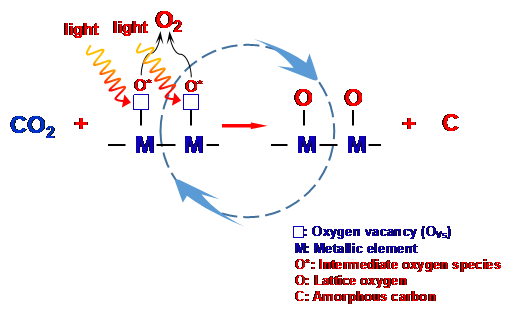 晶体缺陷在光生电荷分离、传输与分子活化等方面均具有重要的影响,课题组相继在缺陷态表界面能量调控方面取得了系列进展,利用氧空位活化促进CO2 还原(Adv. Funct. Mater. 2017, 27, 1702447),揭示了表面缺陷态对界面电荷传输行为的影响机制(ACS Appl. Mater. Interfaces 2017, 9, 33887;J. Mater. Chem. A, 2017, 5, 12848),探索了缺陷态对电化学反应表、界面热力学与动力学过程的影响规律(J. Mater. Chem. A, 2017, 5, 8402;J. Mater. Chem. A, 2017, 5, 20439;ChemSusChem 2017, 10, 2897;ChemSusChem 2017, DOI: 10.1002/cssc.201701679)。在上述工作的基础上,近期,课题组提出了利用光致缺陷辅助直接分解氧化物分子产生氧气的反应途径,其机理为:利用光腐蚀反应,通过光生空穴腐蚀氧化物半导体材料中的O原子产生氧缺陷活化、捕获目标气体分子中的O,因氧化物分子中的氧原子被催化剂晶格氧空位捕获而有效抑制了逆反应过程,并因光生空穴的持续性氧化而释放O2,光生电子还原COx,SOx,NOx分子中的C、S和N物种,实现分解这些分子为相应的C、S和N2。这一反应途径所需能量消耗较低,并且可以实现持续性光照分解气态分子产O2,是一种理想的密闭空间内移除气态氧化物分子供氧技术,在太空探索(比如载人宇宙飞行器)、海洋探索(比如水下载人勘探)、民防工程以及大型公共密闭空间内的生态系统构建方面具有潜在的应用前景。该工作以“Oxygen-Vacancies Activated CO2 Splitting over Amorphous Oxide Semiconductor Photocatalyst”为题发表在美国化学会催化期刊《ACS Catalysis》杂志上(DOI: 10.1021/acscatal.7b02952)。