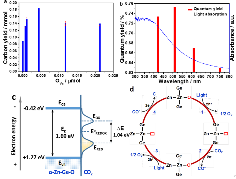 图a. 光致氧空位浓度与碳产率关系;图b. CO2分解反应量子效率;图c. 光催化材料的能级位置与CO2分解能量需求;图d. 分子分解反应经历了两个光反应与两个暗反应步骤。