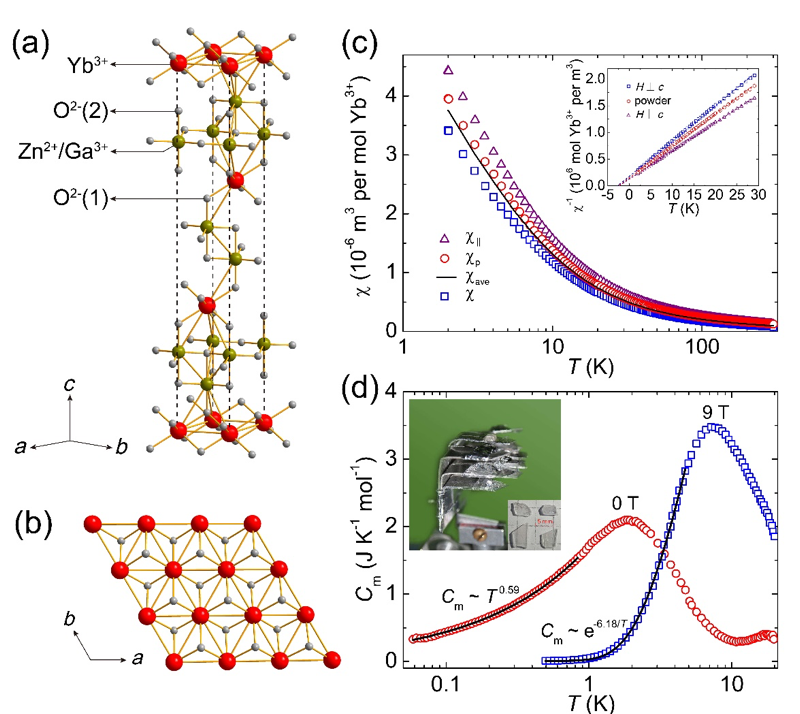 图2. (a) YbZnGaO4晶体结构图; (b) Yb3+磁性层的俯视图; (c) YbZnGaO4单晶和多晶直流磁化率测试结果; (d) 0 T和9 T磁场下的磁比热测试结果; 插图为YbZnGaO4单晶样品。